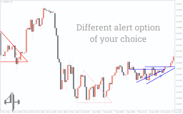 The indicator plots arrows on the chart in addition to triangles. The arrows’ appearance serves as confirmation. There is a blue arrow following the uptrend and a red arrow following the downward triangle. The direction of the trend is shown by the pattern’s formation. Traders can then adjust their positions appropriately.