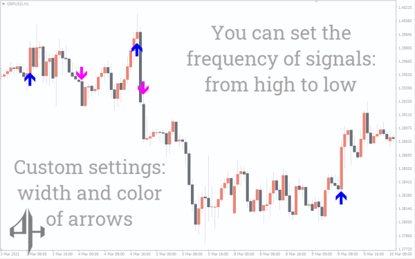 It calculates how many bars there are on a chart and how far apart they are. Based on the information provided, the indicator creates an arrow that suggests whether to buy or sell.