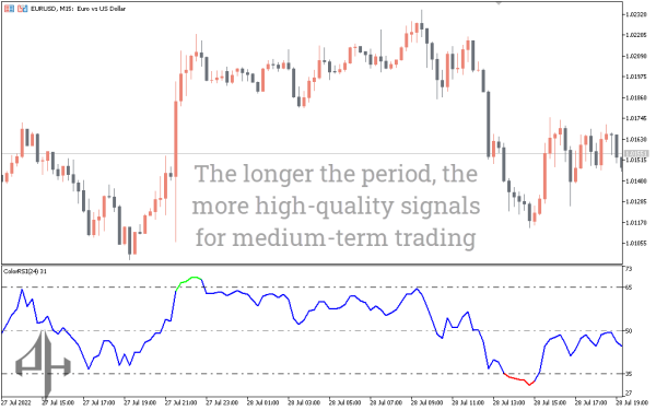 To help them follow the full trend, forex technical traders should maintain their positions until the opposite trading signal appears or until the oscillator’s values enter the overbought range. To find a profit-taking technique, forex traders could, nevertheless, use other technical strategies or candlestick patterns. This signal performs well in downward technical analysis since traders can use it on any chart. As a result, traders can use Color RSI Indicator to ascertain the trend’s direction over a longer time frame. At the same time, you can identify the optimal entry and exit positions by using charts with shorter time frames.