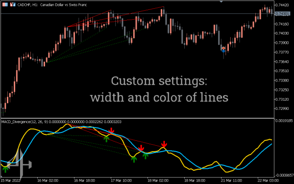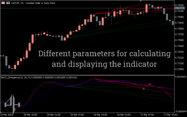 Convergence and divergence are automatically detected and drawn. The best divergence indicator for MetaTrader 5 based on MACD divergence.