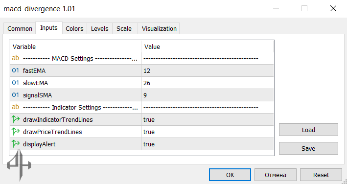 There are settings for the MACD indicator and additional parameters to show the trendlines in the MACD Divergence indicator.