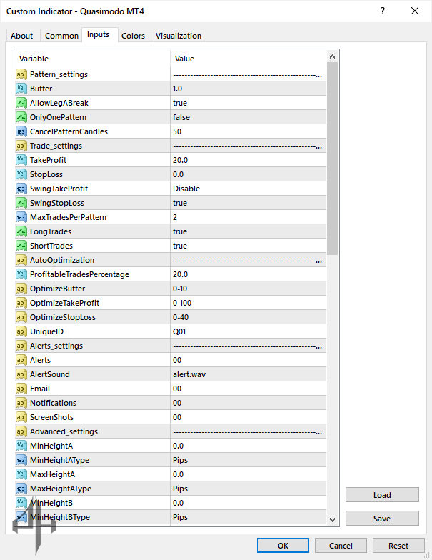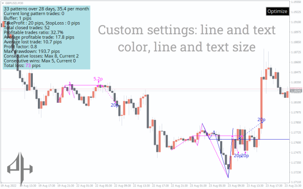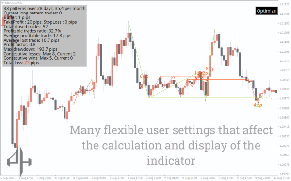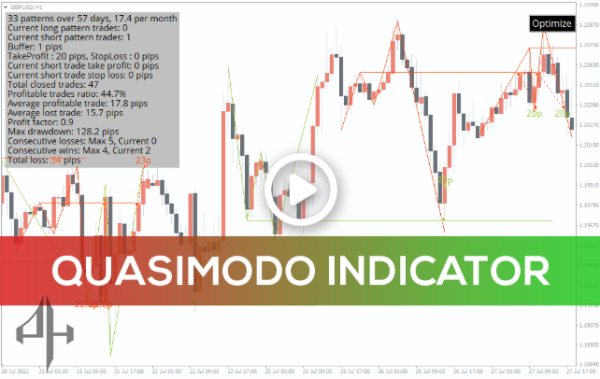 The Quasimodo MT4 indicator is display in action in the GBPUSD H1 chart above. The display screen, in particular, provides comprehensive statistics about previous virtual trades of this pattern. For any desired currency pair and time frame, forex traders can therefore optimize to find the optimal parameters.