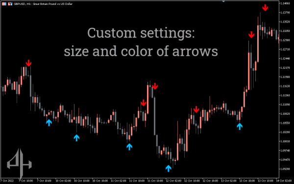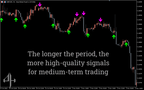 The indicator’s straightforward arrow indications make it incredibly user-friendly for Forex trading. A bullish trend is indicated by green arrows, and a negative trend is indicated by purple arrows.